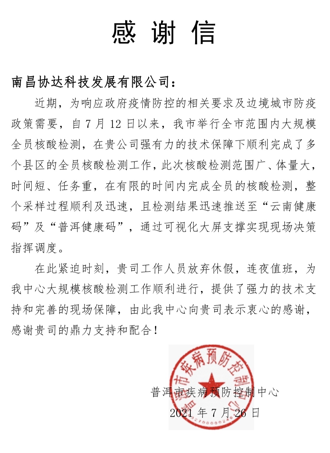 近日,我公司收到一封來自云南省普洱市疾控中心關于“技術保障云南邊境核酸檢測”的感謝信,我公司全體同仁除了感謝普洱市疾控中心肯定及信任之外,更多的是一份承諾和責任。多年來,協達科技一直用“匠心”精神踐行“贏得客戶尊重”的理念,始終秉持“匠心”專注一個行業、一件事,不辜負行業,不辜負未來。