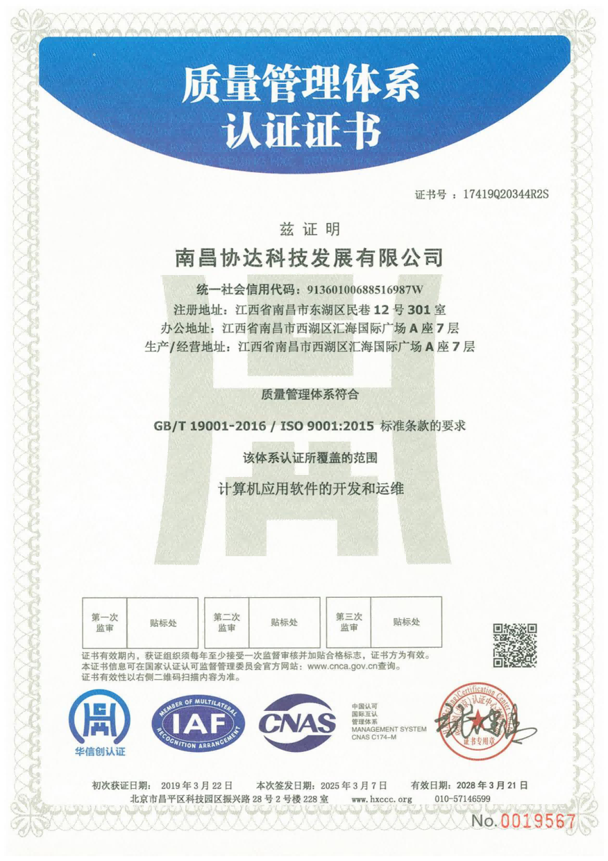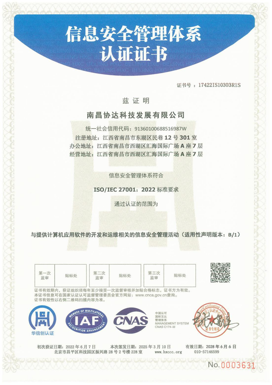 協(xié)達(dá)科技成立于2009年5月,憑借高端的軟件研發(fā)技術(shù)及先進(jìn)的管理理念順利通過(guò)保密資質(zhì)、國(guó)家高新技術(shù)企業(yè)資質(zhì)認(rèn)定及江西省“專精特新”中小企業(yè)資質(zhì)認(rèn)定,先后獲得CMMI3級(jí)證書、ITSS運(yùn)維服務(wù)、CCRC軟件安全開發(fā)、ISO27017、ISO27001及三體系認(rèn)證證書等。